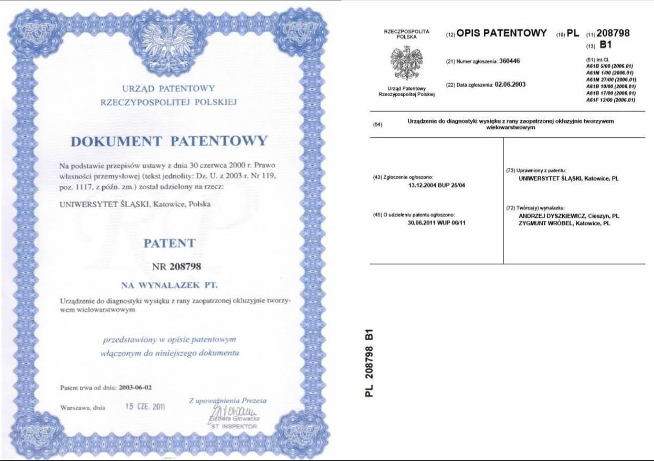 Patenty (1) (2) (3) (4) (5) (6) Urządzenie do diagnostyki wysięku z rany zaopatrzonej okluzyjnie tworzywem wielowarstwowym budowa prototypu podciśnieniowego na podstawie przyznanego patentu PL 208798